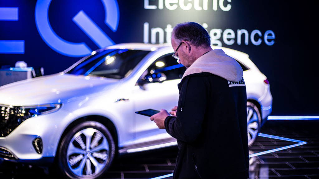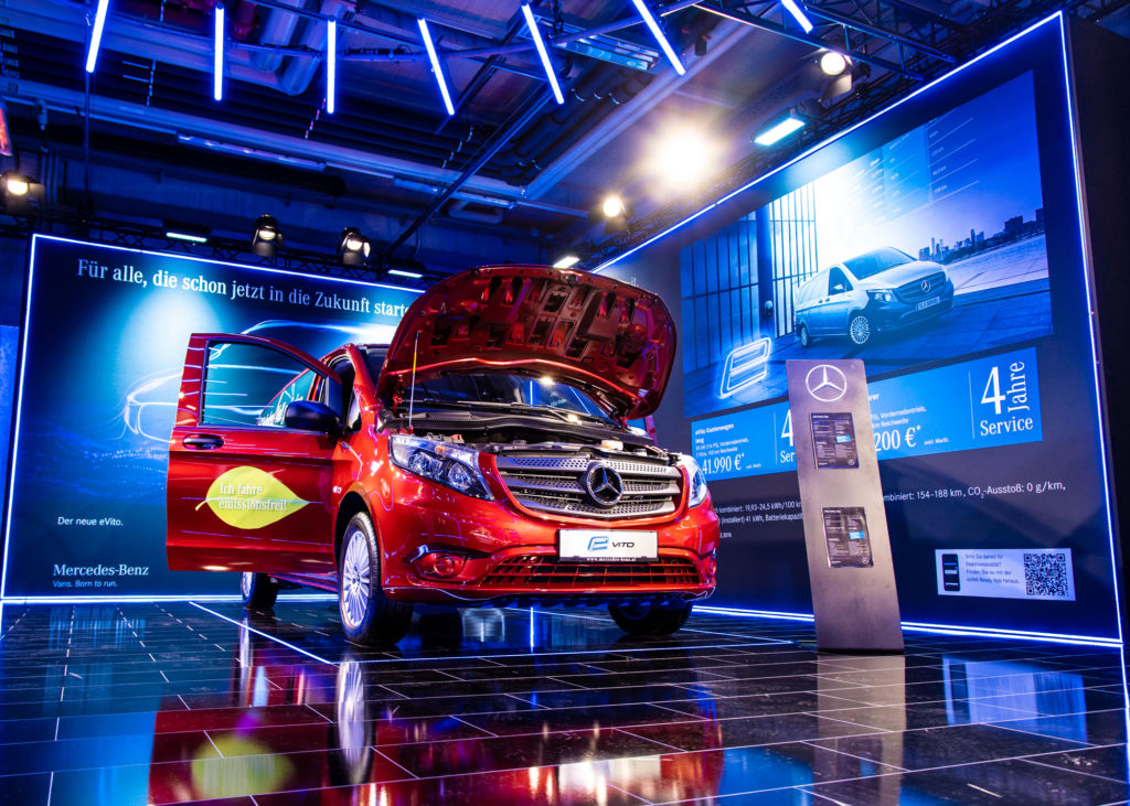 Der neue Mercedes EQC glänzt in der Messebox am Spielberg. An der Decke hängen Astera Pixel Tubes, besondere Leuchten, die dem Motto der High-Tech-Elektronik gerecht werden und den Messestand beleuchten. Rund um das Auto sind im neu verlegten Laminatboden LED-Stripes eingefräst. Rundherum vermittelt die Dekoration ein angenehmes Ambiente. Sogar die Musik im Hintergrund passt dazu.