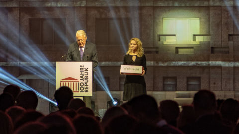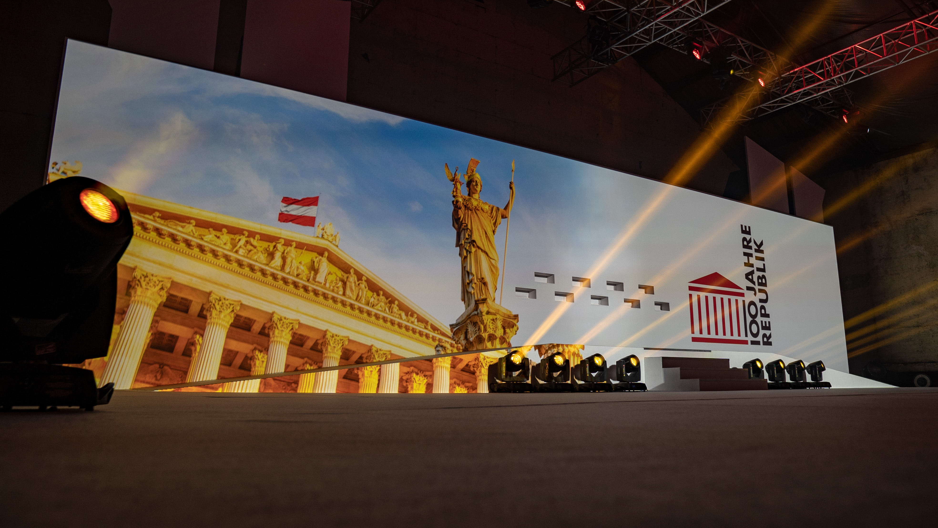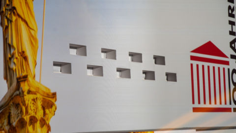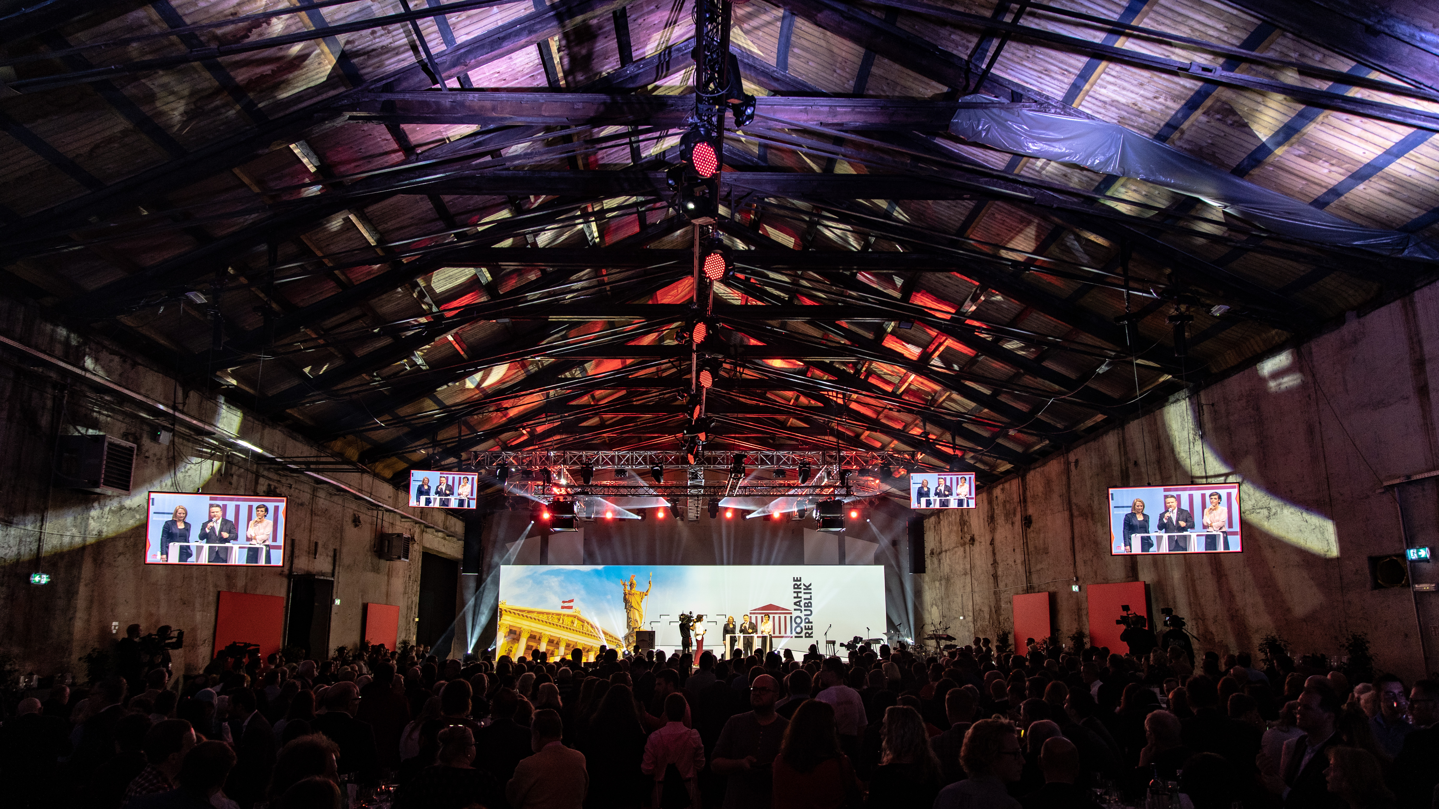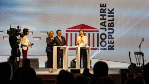 Im Rahmen der Veranstaltung „100 Jahre Republik“ in der Gösserhalle im 10. Wiener Gemeindebezirk wurde neben zahlreichen Reden auch eine beeindruckende Show auf der Bühne geboten. Acht Rednerinnen und Redner bauten mit jeweils einem Baustein das Bühnenbild mit, um ein großes Ganzes zu bilden – das Parlament. Die Bausteine waren thematisch orientiert und behandelten Themen wie das Wahlrecht, den 8-Stunden-Tag, den Gemeindebau, Bildung und Arbeiterbüchereien, den Wiederaufbau, die Ära Kreisky und Europa.