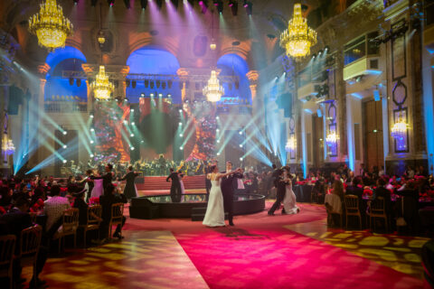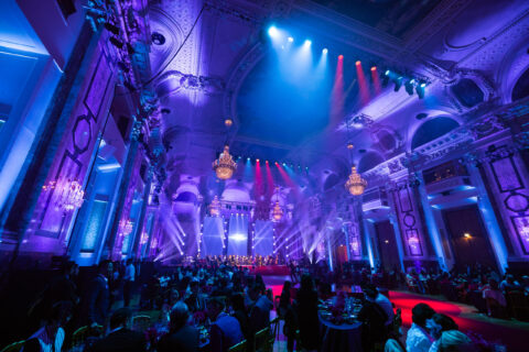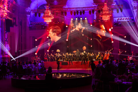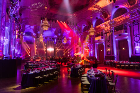 Während drei optisch schwebende LED-Displays inkl. passendem Content die Aufmerksamkeit auf die Bühne des Festsaals der HOFBURG lenkten, sorgten aufwändige Lichteffekte, Projektionen und eine extern zugelieferte Center Stage inklusive Air Fountain während des exklusiven Events für Begeisterung. Das Mapping an der historischen Decke, gestaltet unter der kreativen Leitung von Wilson Dow sowie umgesetzt durch unsere Partnerfirma Media Apparat, stand dabei besonders im Fokus. Da die Projektoren für das Mapping am Boden, im Bereich der Gala-Fläche, platziert werden mussten, galt es für unsere Profis eine möglichst dezente Konstruktion für die Projektion zu entwerfen und umzusetzen. Eine zusätzliche Herausforderung, die von unserem Team vor Ort ebenfalls gemeistert wurde, war das passend abgestimmte Zusammenspiel aus Licht und Mapping. Denn da das Lichtdesign von Wilson Dow umfassender war als sonst für den Festsaal der HOFBURG üblich, wurde besonderes Augenmerk auf die Lichtstärke gelegt, um den Effekt des Mappings selbst nicht abzuschwächen.
