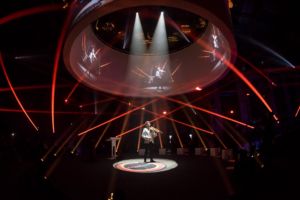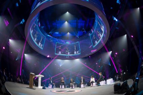 Aus allen Perspektiven – das nahm Habegger Austria bei diesem Auftrag wörtlich. So wurde eine runde Bühne in der Mitte installiert. Auf einer ringförmigen 360 Grad-Projektion konnte das Publikum von allen Seiten das Geschehen auf der Bühne mitverfolgen, Grafiken betrachten und sich dabei wie in einer futuristischen Arena fühlen.