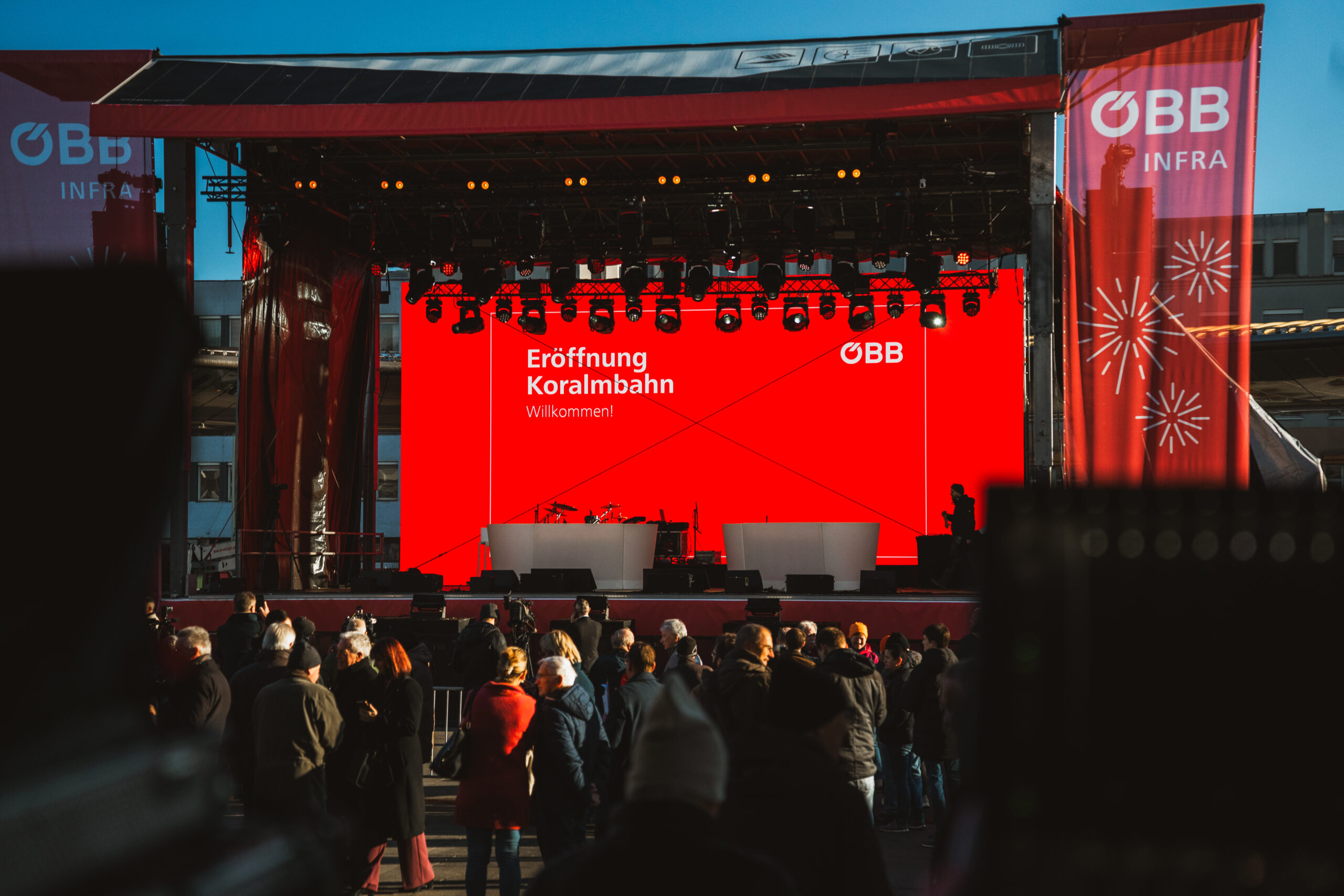 Am 12. Dezember 2025 wurde mit der offiziellen Eröffnung der Koralmbahn eines der bedeutendsten Infrastrukturprojekte Österreichs feierlich eingeweiht. Die neue Hochleistungsstrecke verbindet Graz und Klagenfurt in rund 41 Minuten und gilt als strategisches Herzstück der Südstrecke. Für dieses Großereignis wurden wir von der ÖBB Werbung GmbH mit der ganzheitlichen eventtechnischen Umsetzung an beiden Standorten beauftragt. Ein Projekt, das unser Team gemeinsam mit dem Auftraggeber fast ein Jahr präzise bis ins kleinste Detail geplant und schließlich perfekt umgesetzt hat.