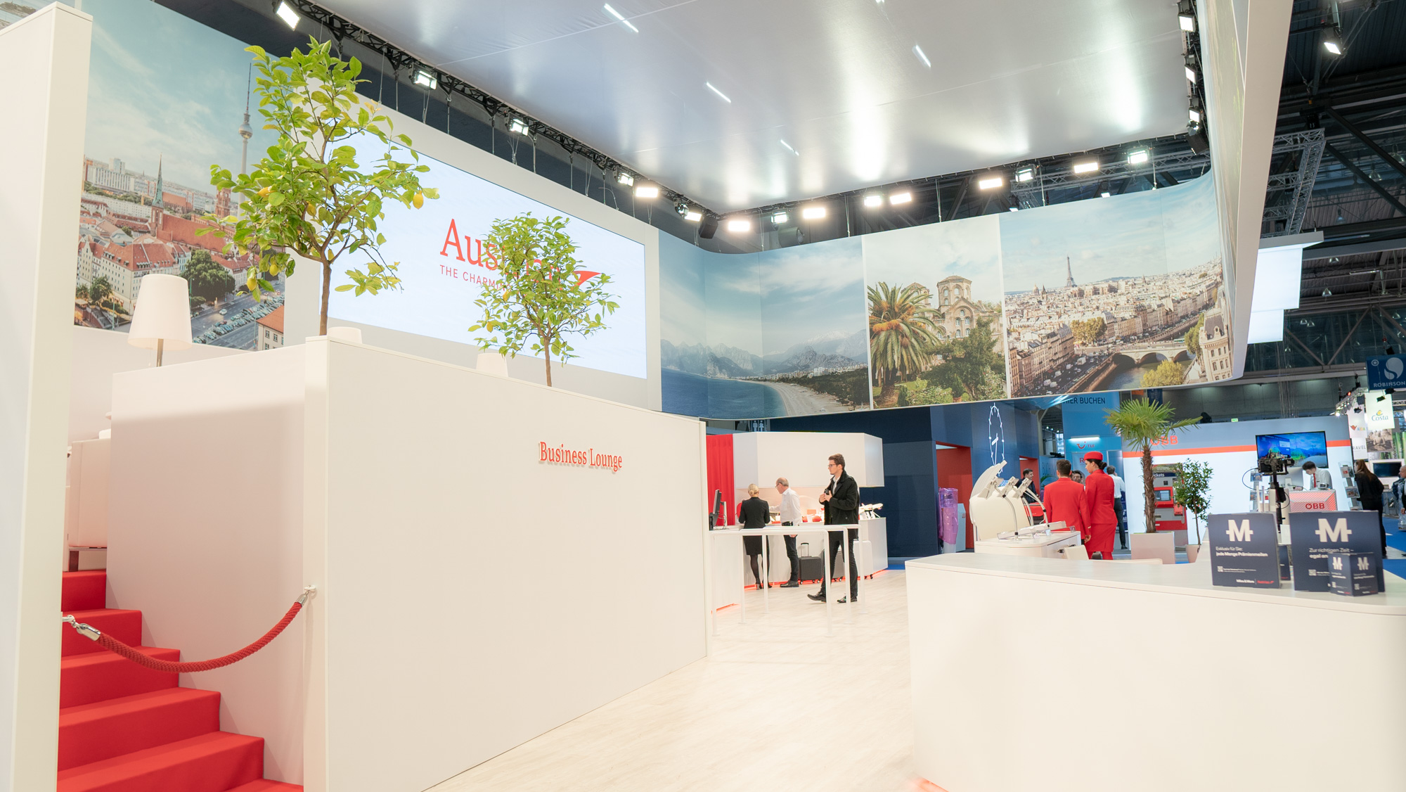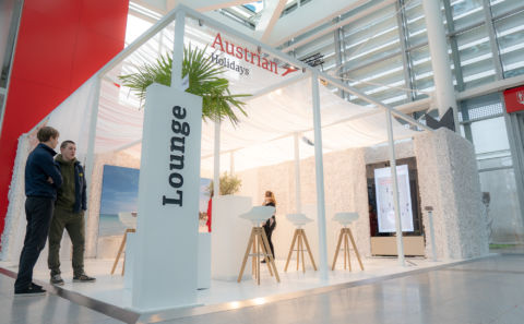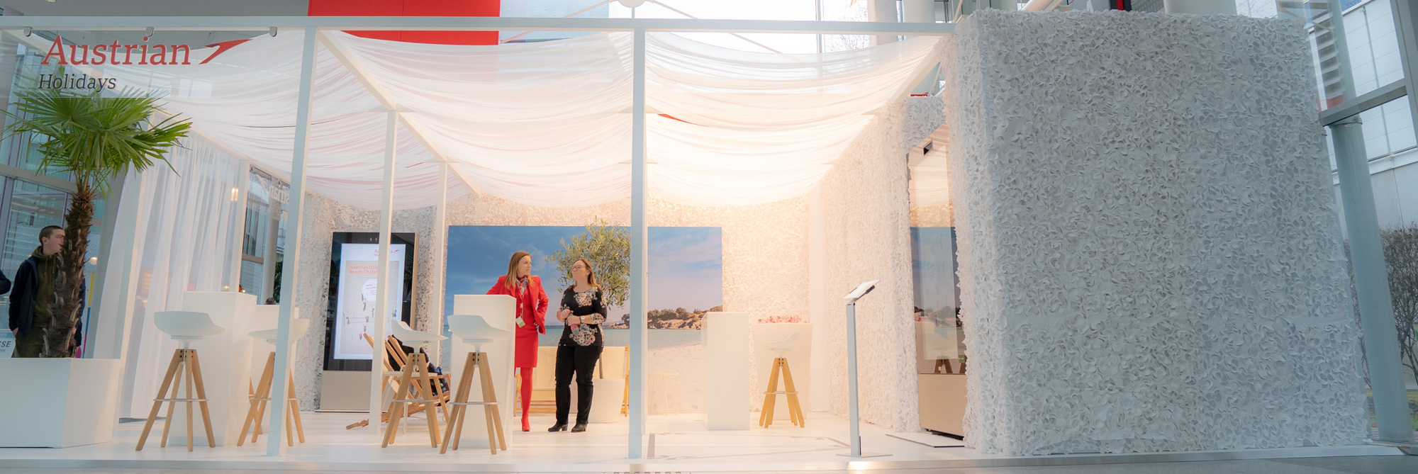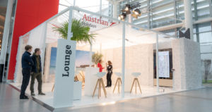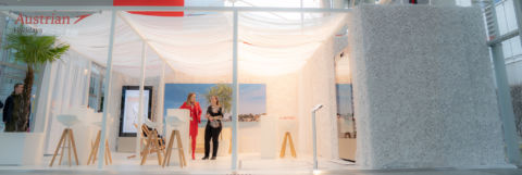 Für den hellen, luftigen Messeauftritt bei der Ferienmesse 2019 in der Messe Wien wurde Habegger mit der technischen Ausstattung des Messestandes von Austrian Airlines beauftragt.