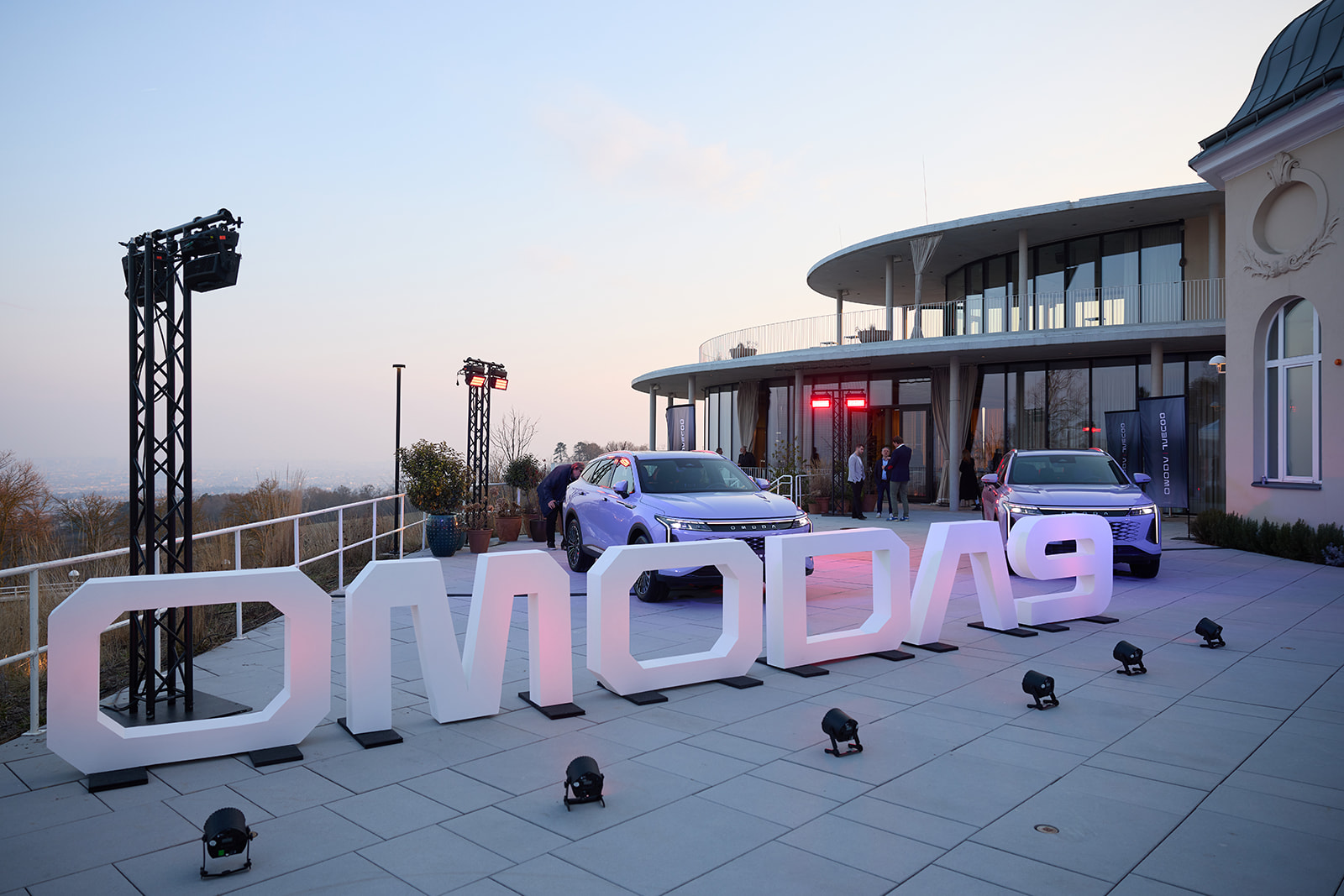 Für die immersive Österreich-Premiere mit rund 250 Gästen in der Eventlocation Weitsicht Cobenzl, perfekt für kleine Feiern oder auch Feste im großen Stil mit einem unvergleichlichen Ausblick hoch über den Dächern Wiens, verantworteten wir die Licht-, Audio- sowie Videotechnik im Innen- und Außenbereich. Zum Beispiel mit einem insgesamt 60 Meter langen LED-Display, der die Seitenwände des Raumes flankierte. Außerdem übernahmen wir den Bühnen- sowie Podestbau für die Präsentation des OMODA 9.
