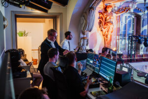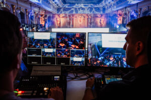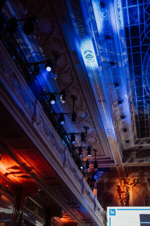 Auch in diesem Jahr waren wir ganzheitlich für die Technik des Events verantwortlich. Ein innovatives Beleuchtungskonzept aus Ambiente- und Effektbeleuchtung brachte die historischen Räumlichkeiten im Haus der Industrie im wahrsten Sinne zum Strahlen – angefangen vom Eingangsbereich bis zu den beiden Festsälen. Dank der in das Stagedesign integrierten lichtstarken Projektionen konnten sowohl live übertragene Bühnengeschehnisse als auch relevante Grafiken im gesamten Festsaal mitverfolgt werden. Herausfordernd war – wie in den meisten historischen Locations – die Beschallung. Um Diskussionen und Keynotes für alle gut verständlich zu machen, setzten wir deswegen auf ein ausgeklügeltes, kleinteiliges Beschallungskonzept im Festsaal. Auch unser Dekorationsteam war im Rahmen dieses Projekts besonders gefragt: Mit vielen Sonderbauten und detailreichen Elementen sorgten sie für ein stimmiges Ambiente, perfekt eingefügt in die historischen Räumlichkeiten.