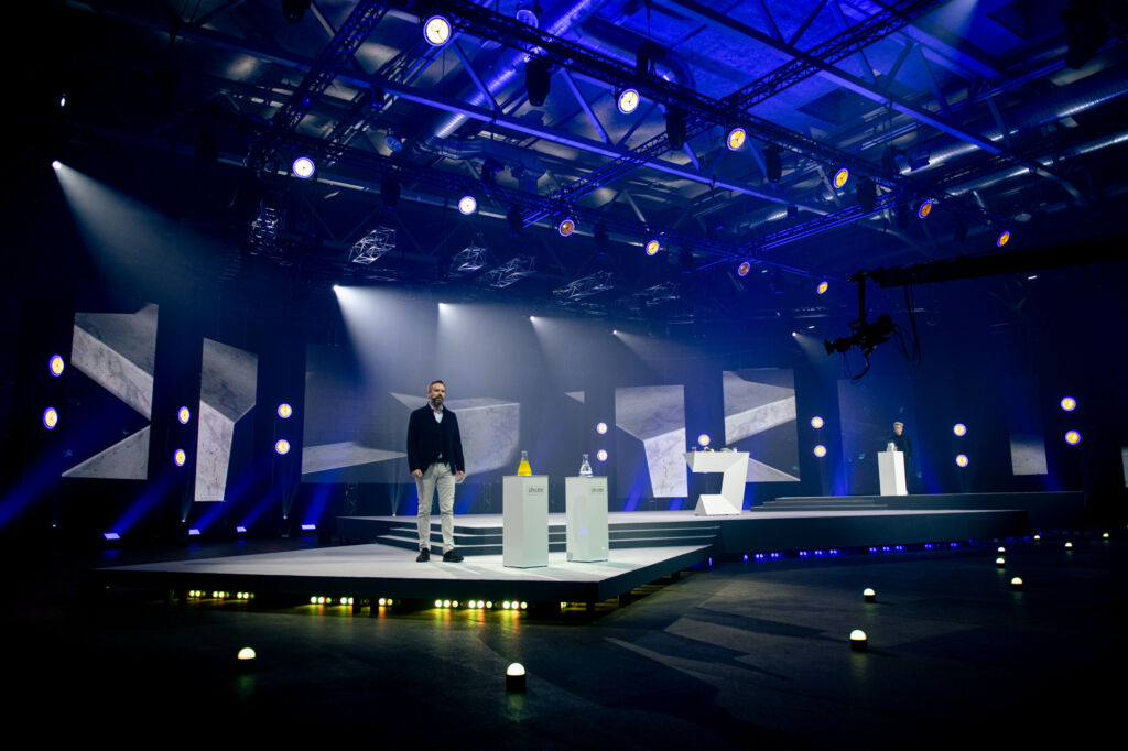 Eine Besonderheit bei virtuellen Events ist die Möglichkeit, Studiogäste aus der ganzen Welt virtuell auf die Bühne zu holen. Auch hier ist technisch vieles möglich: „Wichtig ist, dem Studio-Gast auf der LED-Wand einen richtigen Platz zu geben, um ihn präsenter zu machen. In letzter Zeit haben wir verstärkt Hollogramme mitten in den Raum gestellt. Da konnte der Moderator von Angesicht zu Angesicht mit der Person sprechen, die in Wirklichkeit gar nicht da war, sondern nur mithilfe eines Ganzkörper-Videos eingespielt wurde“, verrät der Habegger-Projektleiter. Diese Variante hat sich vor allem in Zeiten von Reisebeschränkungen bewährt: Denn für den Zuschauer macht es dank Hollogramm-Technik keinen Unterschied, ob die Person wirklich auf der Bühne steht, oder nur virtuell.